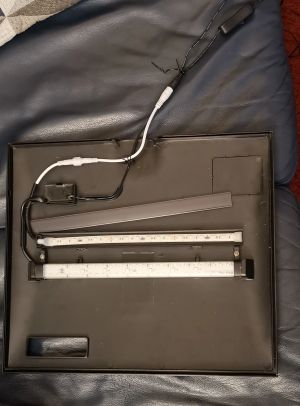 Die blauen LEDs sind recht hell. Anstelle des Dimmers habe ich ein schwarzes Profil (breit) mit dunkler Abdeckung bestellt. Diese sorgt für diffuses Licht und dimmt es ausreichend.