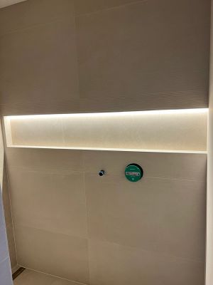Dieses LED Profil eignet sich für eine Wand mit Fliesen oder als Stuckstopp für Stuck. Sowohl der LED Streifen als auch das LED Profil können unsichtbar in der Wand integriert werden, wodurch ein eleganter und luxuriöser Look entsteht.