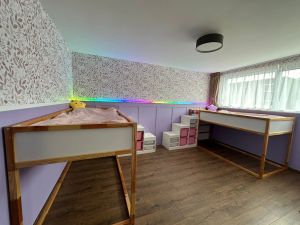 Die LEDs sind hinter einer Trennwand unter dem Schreibtisch platziert und beleuchten Boden und Wand.