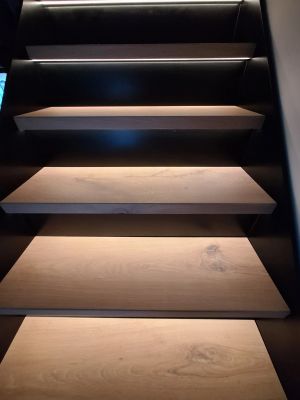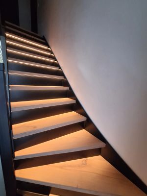 Sie können die Treppenbeleuchtung dimmen und in unterschiedlichen Geschwindigkeiten einschalten. Dadurch kann das Licht schön nach oben und unten fließen. echter Hingucker unserer Halle.
